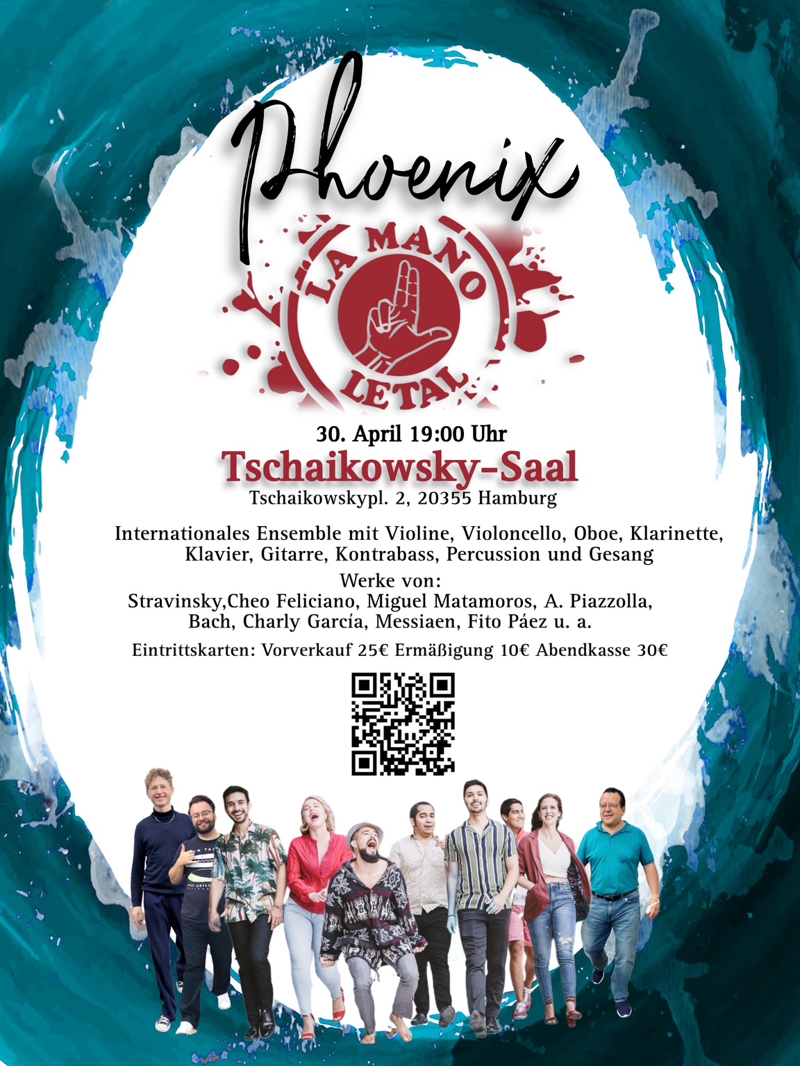 Die internationale Kammerformation vereint Gesang, Violine, Oboe, Klarinette, Klavier, Gitarre, Kontrabass sowie ein breites Spektrum an Percussionsinstrumenten. Musikerinnen und Musiker aus verschiedenen Ländern bringen ihre kulturellen Hintergründe ein und formen gemeinsam einen lebendigen Klangkörper – ein musikalischer Phönix, der sich immer wieder neu erhebt.